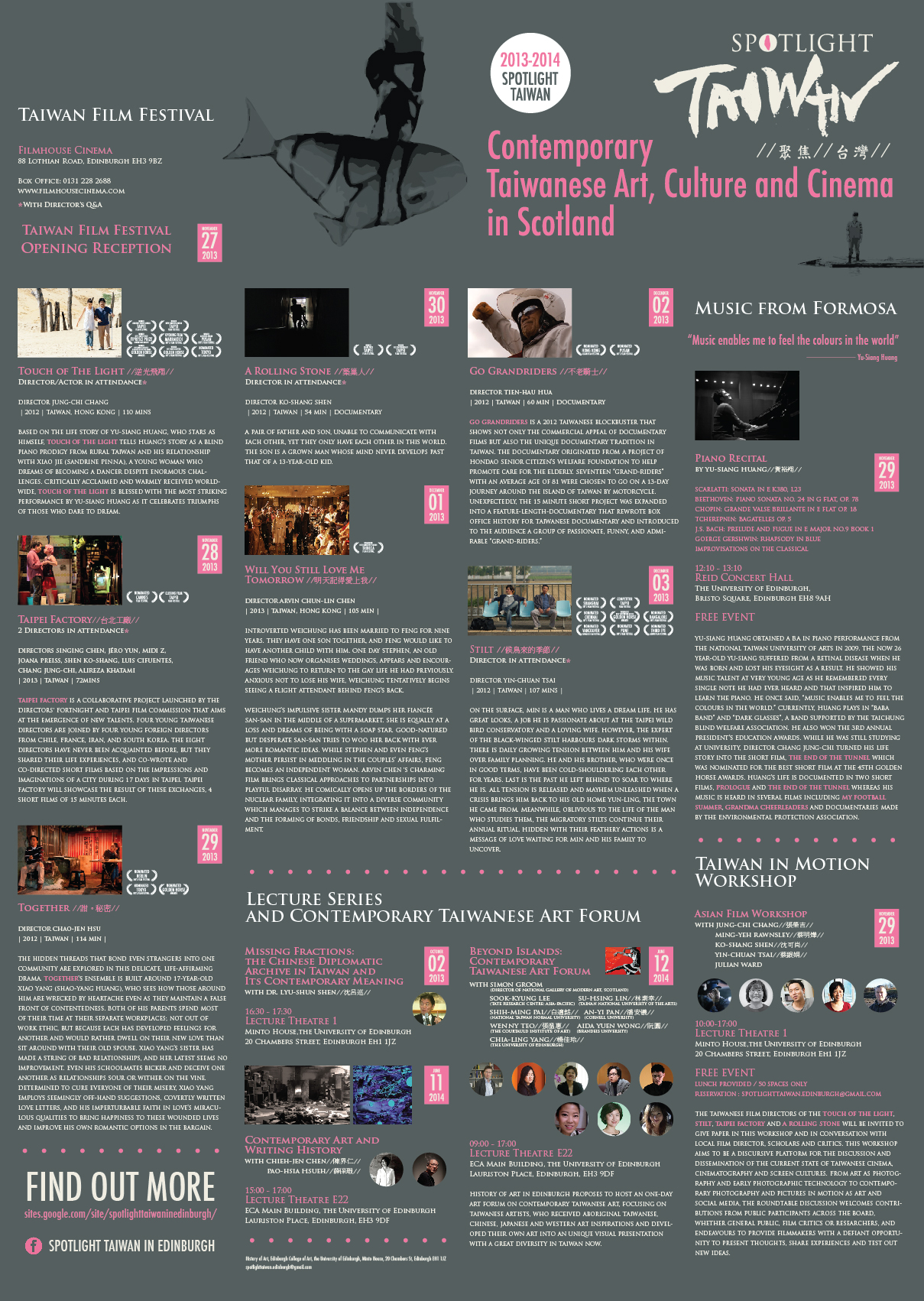Programme 2025 2024 2023 2022 . Tehching Hsieh 2022 Spotlight Taiwan Filmfest Pei-hsin Cho and Su-Hsing Lin 2021 2021 Spotlight Taiwan Film Festival & Lectures Audrey Tang Yu Cheng-Ta Lee Mingwei 2020 2020 Spotlight Taiwan Film Festival & Poster Kao Chien-Hui Yuan Goang-Ming 2019 2019 Spotlight Taiwan Film Festival & Poster Shu Lea Cheang Ava Hsueh 2018 Wu Tzu-Ning Lin Ching-Hsuan 2017 Wu Mali Symposium 2017 Taiwan Showcase & Spotlight Taiwan poster 2015 Wang Jun-Jieh & Felix Schoeber 2013 – 2014